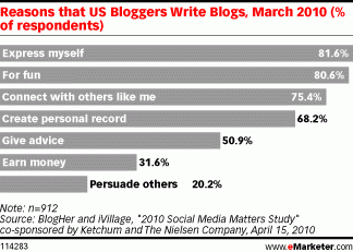 Los bloggers de todas las edades en el sondeo de BlogHer y iVillage, contestaron abrumadoramente que participan en blogs por simple «placer», seguido por la expresión «diversión» en segundo, lugar. La mitad de los bloggers escribió para dar algún tipo de consejo, y menos de un tercio lo hizo con el fin de generar una ganancia económica.